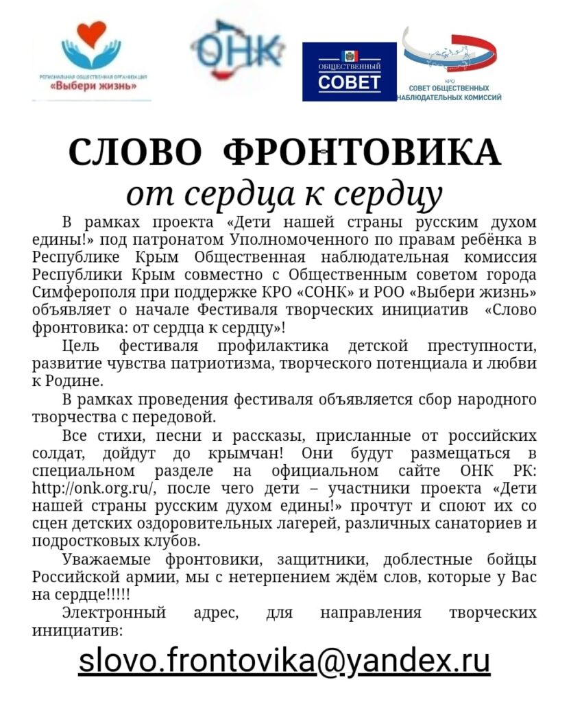 В рамках проведения фестиваля «Слово фронтовика: от сердца к сердцу»! объявлен сбор народного творчества с передовой. Все стихи, песни и рассказы, присланные от российских солдат, дойдут до крымчан! Дети – участники проекта прочтут и споют их со сцен детских оздоровительных лагерей, различных санаториев и подростковых клубов.